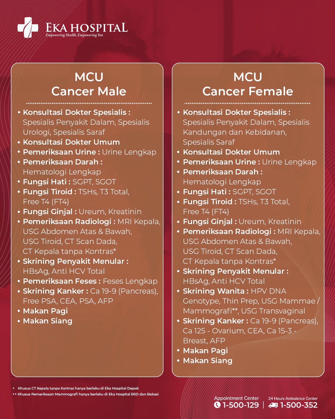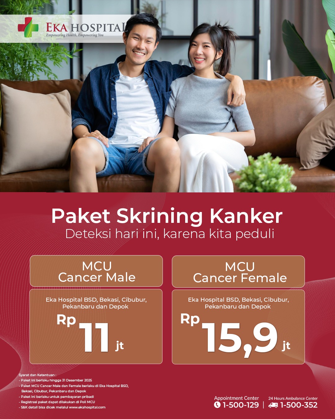Menjaga kesehatan sejak dini adalah hadiah terbaik untuk diri dan keluarga. Eka Hospital menghadirkan Paket Skrining Kanker yang tersedia dalam paket MCU Cancer Male Rp11 juta dan MCU Cancer Female Rp15,9 juta, paket ini berlaku di Eka Hospital BSD, Bekasi, Cibubur, Pekanbaru, dan Depok. Semakin cepat diketahui, semakin besar peluang penanganan efektif. Informasi dan penjadwalan dapat dilakukan melalui Appointment Center Eka Hospital. Promo berlaku hingga Desember 2025.